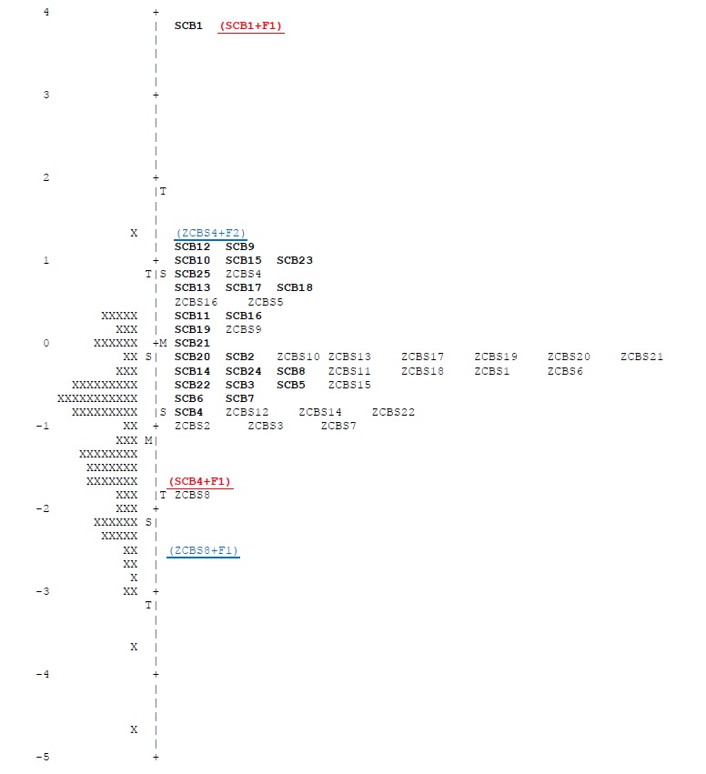 Nota: A la derecha de la figura aparece la distribución en la variable latente de los ítems del SCB-S (letra negrita) y del ZCBS (letra normal). A la izquierda se muestra la distribución de los cuidadores (cada «X» es 1 participante). Los valores extremos del rango medido se muestran en color rojo (SCB-S) y azul (ZCBS).