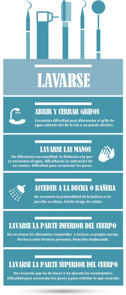 A la hora de lavarse puede presentar un déficit para reconocer los elementos necesarios en el esquema corporal, probablemente no identifique adecuadamente las partes del cuerpo y seguramente necesite supervisión o ayuda física dependiendo del avance de la enfermedad. Puede tener limitaciones perceptivas/sensoriales que le impiden adecuar la temperatura del agua y corre el riesgo de producirse quemaduras. Necesita ayuda para secuenciar los pasos del lavado, para alcanzar determinadas partes del cuerpo o para salir y entrar en la ducha.